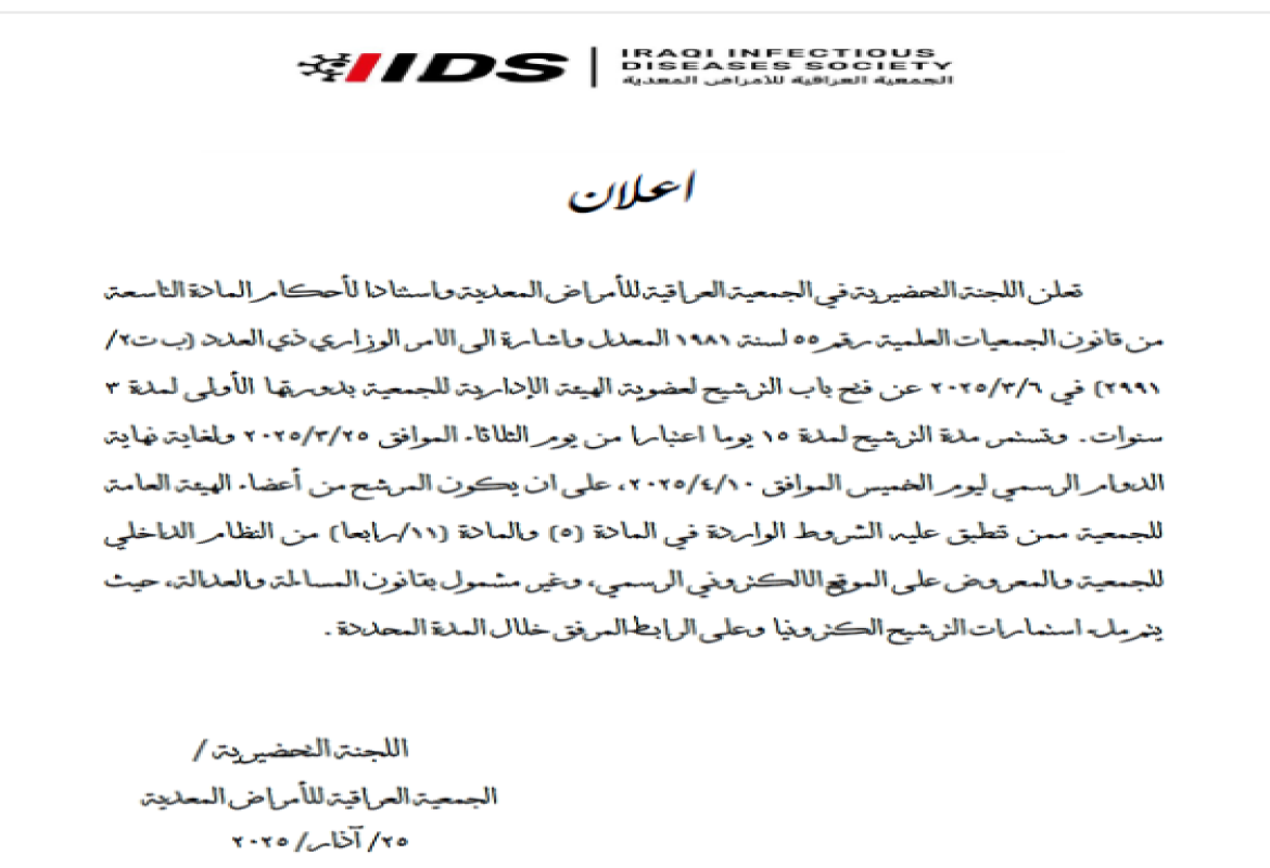 اعلنت اللجنة التحضيرية لانتخابات الهيئة الادارية بدورتها الاولى للجمعية العراقية للامراض المعدية عن موعد الانتخابات وذلك في يوم الثلاثاء القادم الموا…